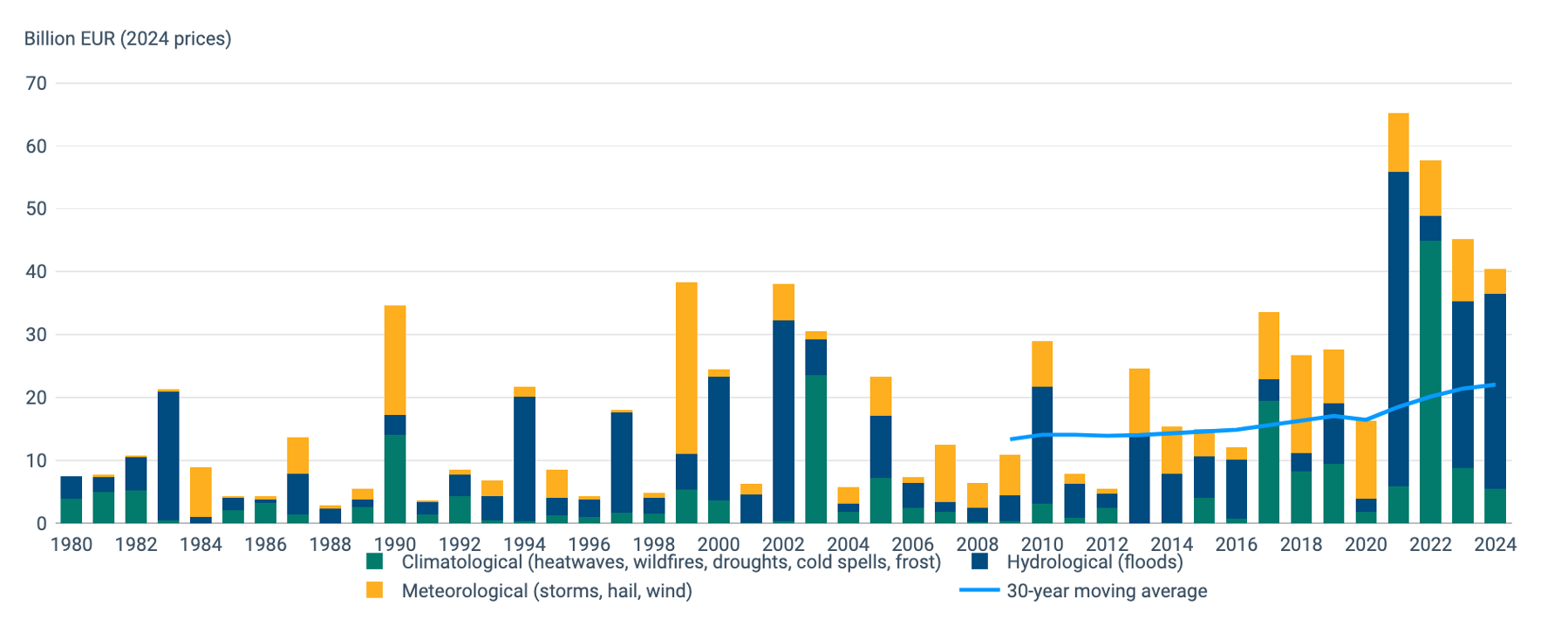 The scale of the problem in Europe is stark. From 1980 to 2024, weather and climate related extremes such as floods, storms, heatwaves, droughts, and wildfires have caused cumulative economic losses of approximately €822 billion across the European Union and associated countries, according to the European Environment Agency. Hydrological hazards, predominantly floods, account for nearly half of that total, with meteorological events such as storms and hail contributing another significant share.